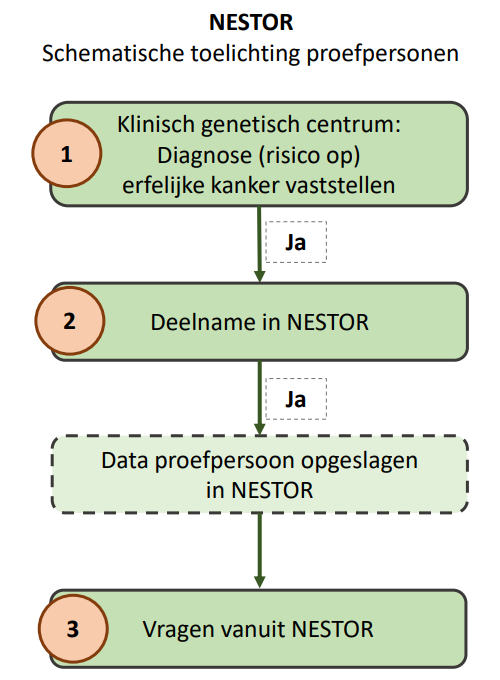 Als u bekend bent met een erfelijke aanleg voor kanker kunt u worden benaderd door het genetisch centrum waar u deze diagnose heeft gekregen. Zij zullen verder uitleg geven over het project en u ook informeren over de deelname. Als u na deze informatie wilt deelnemen aan de NESTOR Registratie, dan kunt u dit aangeven door een toestemmingsformulier (informed consent) te ondertekenen. Dit formulier bevestigt dat u de doelstellingen van de registratie en het gebruik van uw gegevens begrijpt en dat u hiermee akkoord gaat. Ook als u niet wilt deelnemen kan u dit op het formulier aangeven. Bent u nog niet door uw centrum benaderd? Neem gerust zelf contact op om te vragen naar de mogelijkheid voor deelname aan de NESTOR Registratie.
